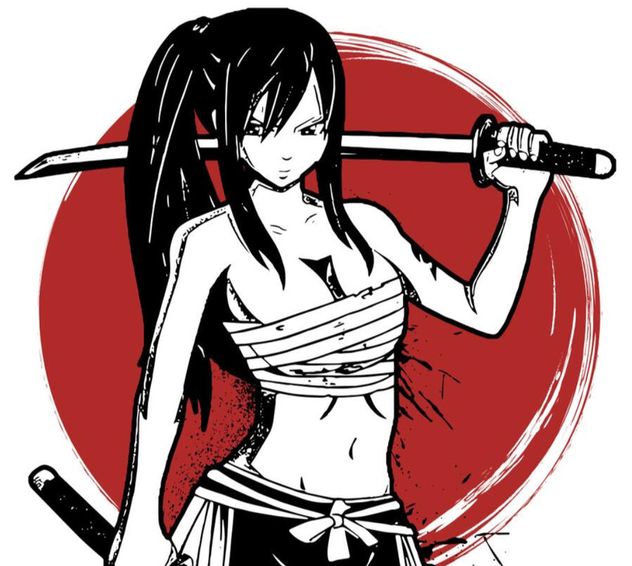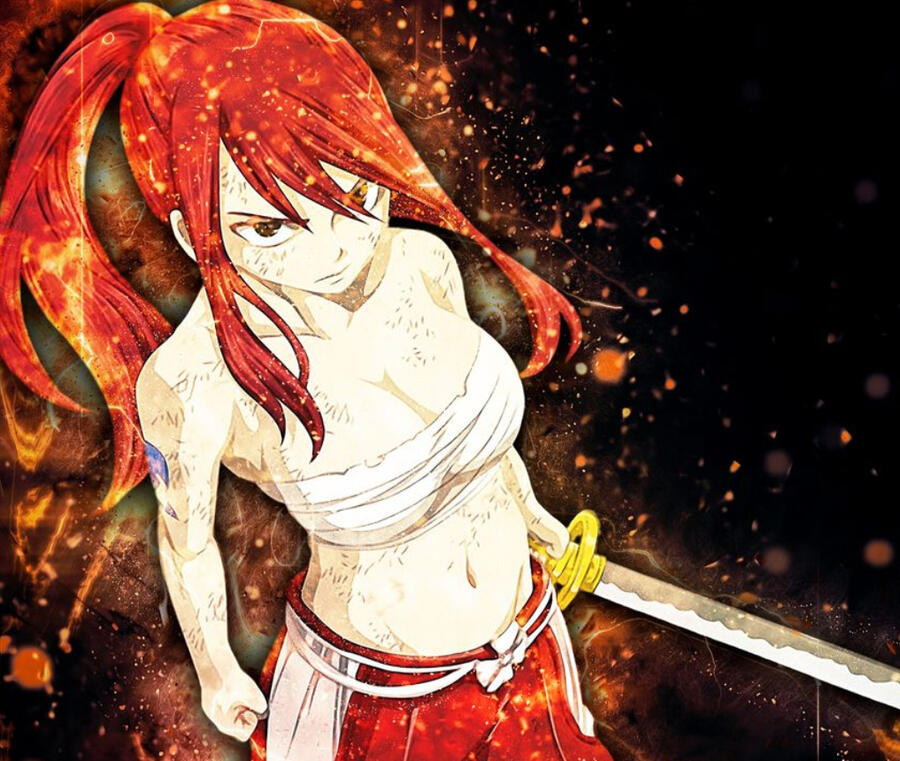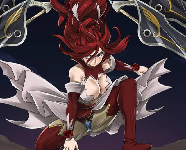 Erza Scarlet of Fairy Tail .This is an independent portrayal of Erza from Fairy Tail . While mostly sticking to canon friendships and personalities , Erza will have MV development that may at times over ride canon .Reference to the canon material can be found HERE
